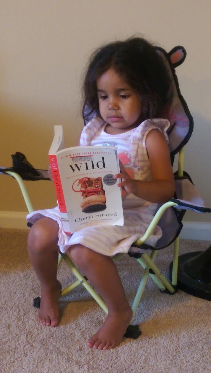 My plan is sort of failing. She loves the story and asks that I turn on the audio whenever we are in the car. However, when I handed her the book while we were stuck in an hour-long wait at the passport office, she was uninterested. She doesn’t have a cell phone or anything. She just sat there doing nothing for an hour.