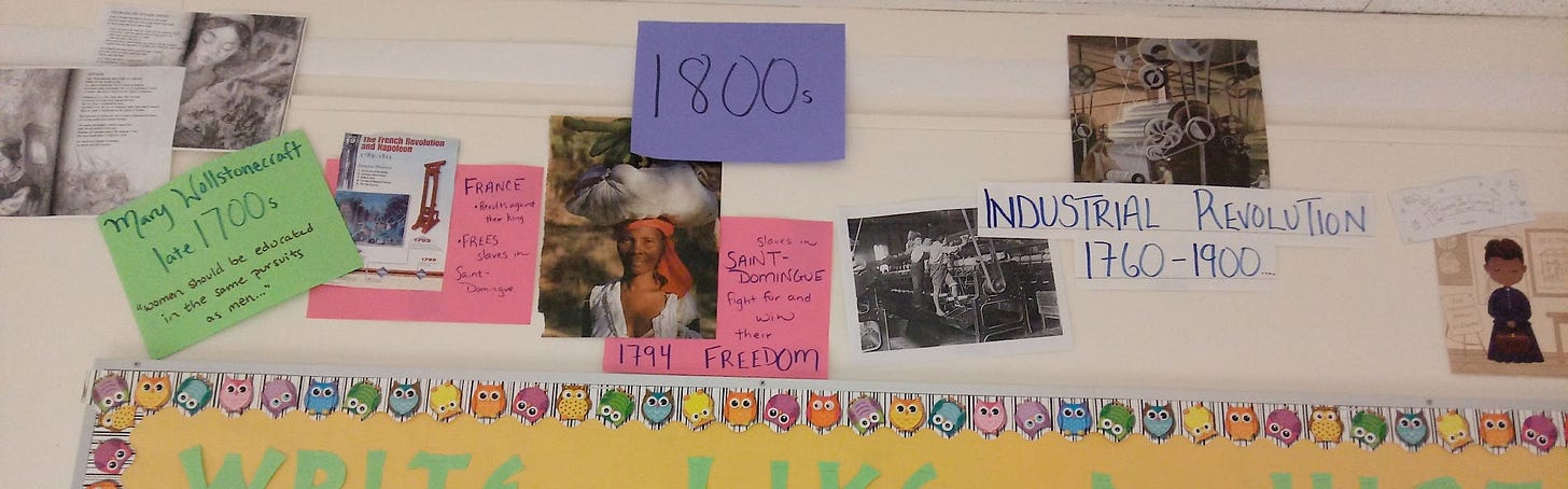 Because I teach World History linearly, I start the year with a blank timeline. Every week or two I write a sentence about what we’ve been learning on colored paper and stick it on the timeline along with a visual we’ve used in class. This helps students remember what they’ve learned AND it helps them contextualize historical moments.